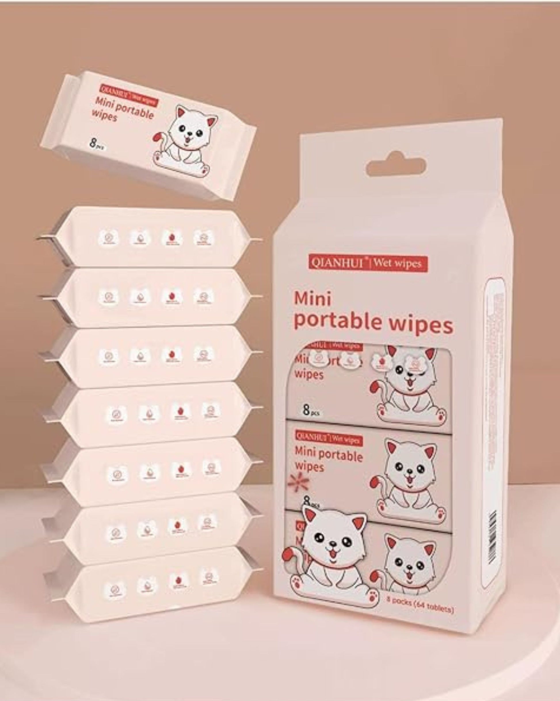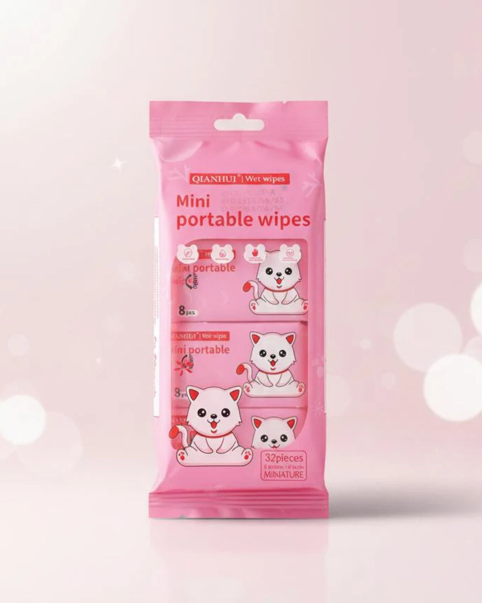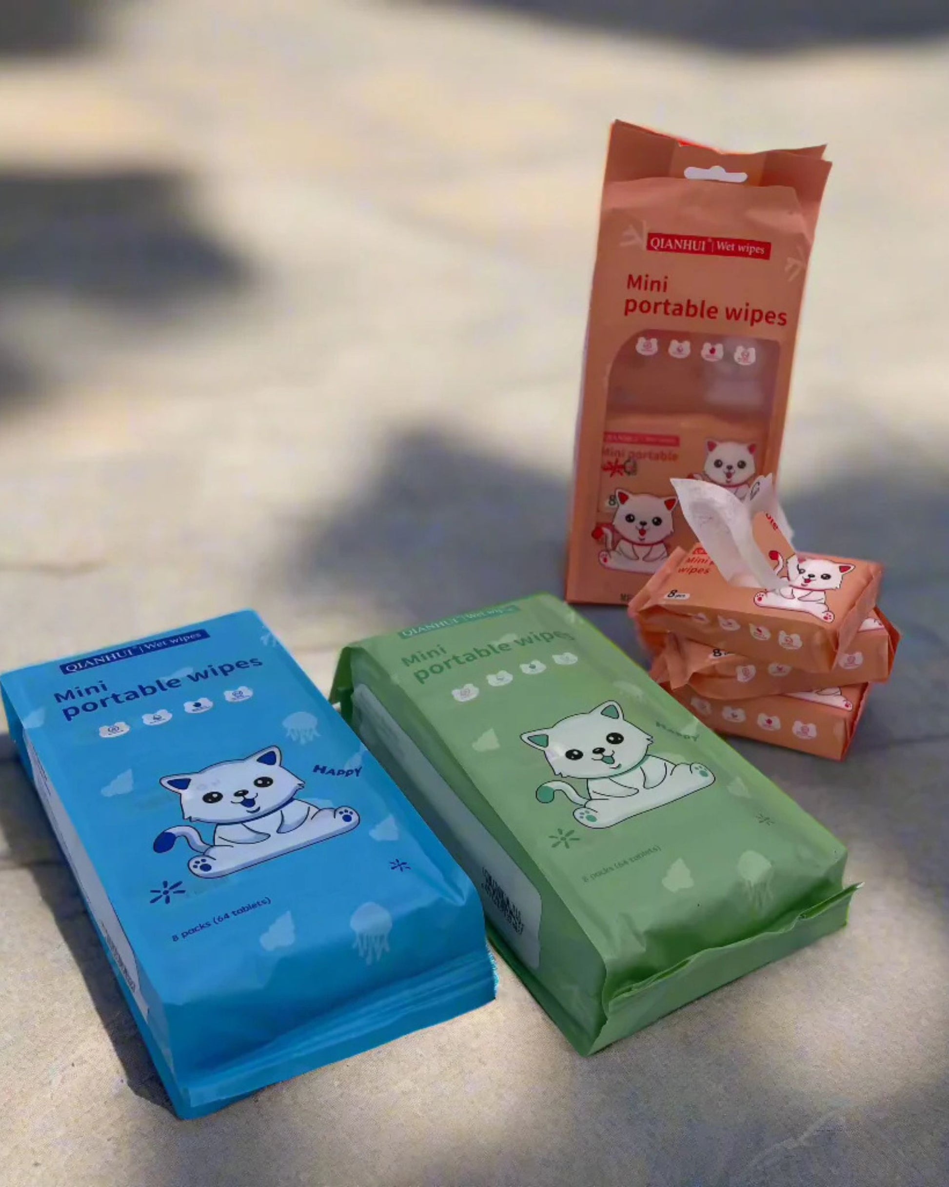 - مناديل مبللة ناعمة وصغيرة لتنظيف اليدين