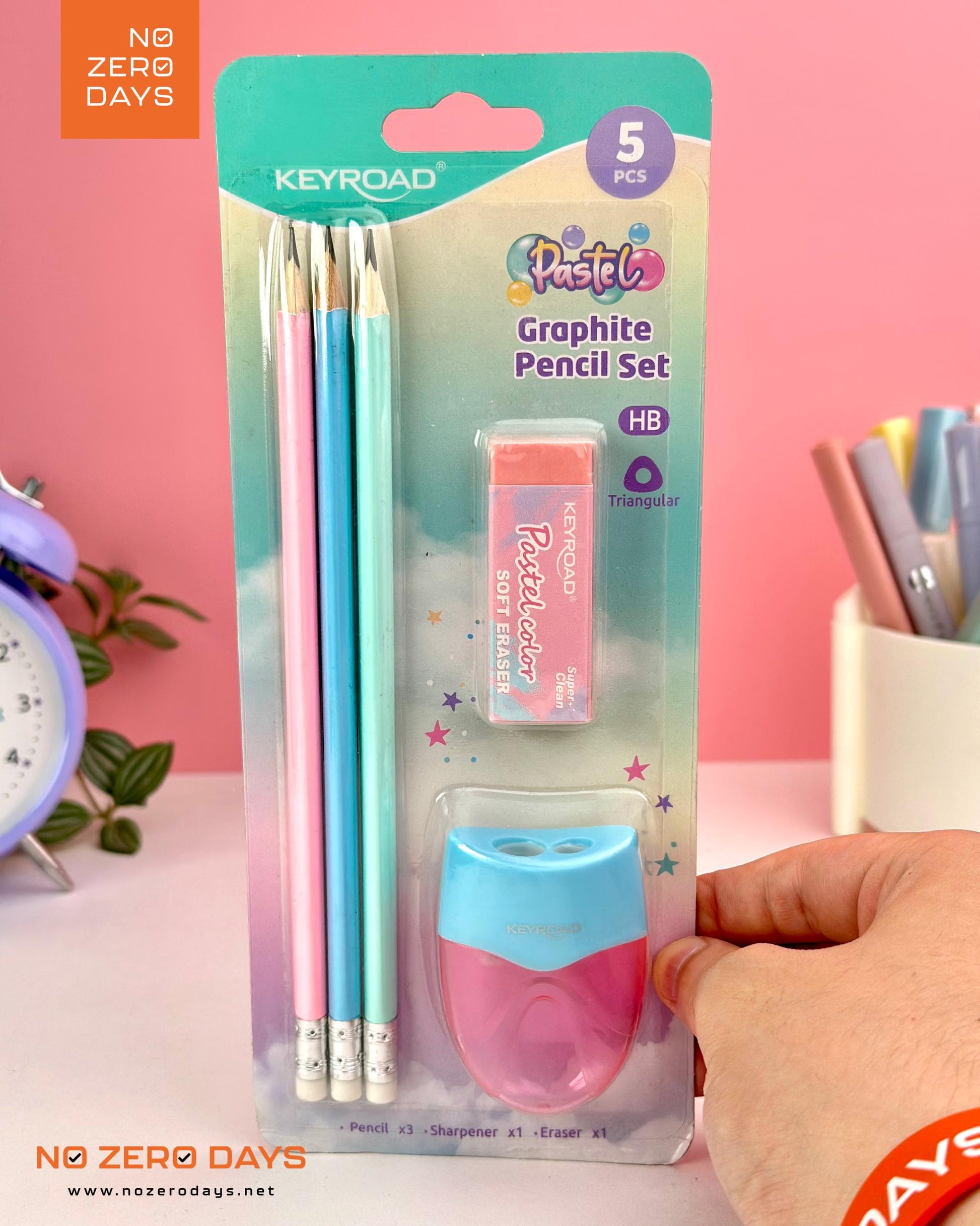 طقم متكامل يحتوي على 3 أقلام رصاص بألوان باستيل عصرية، ممحاة، وبراية مزدوجة