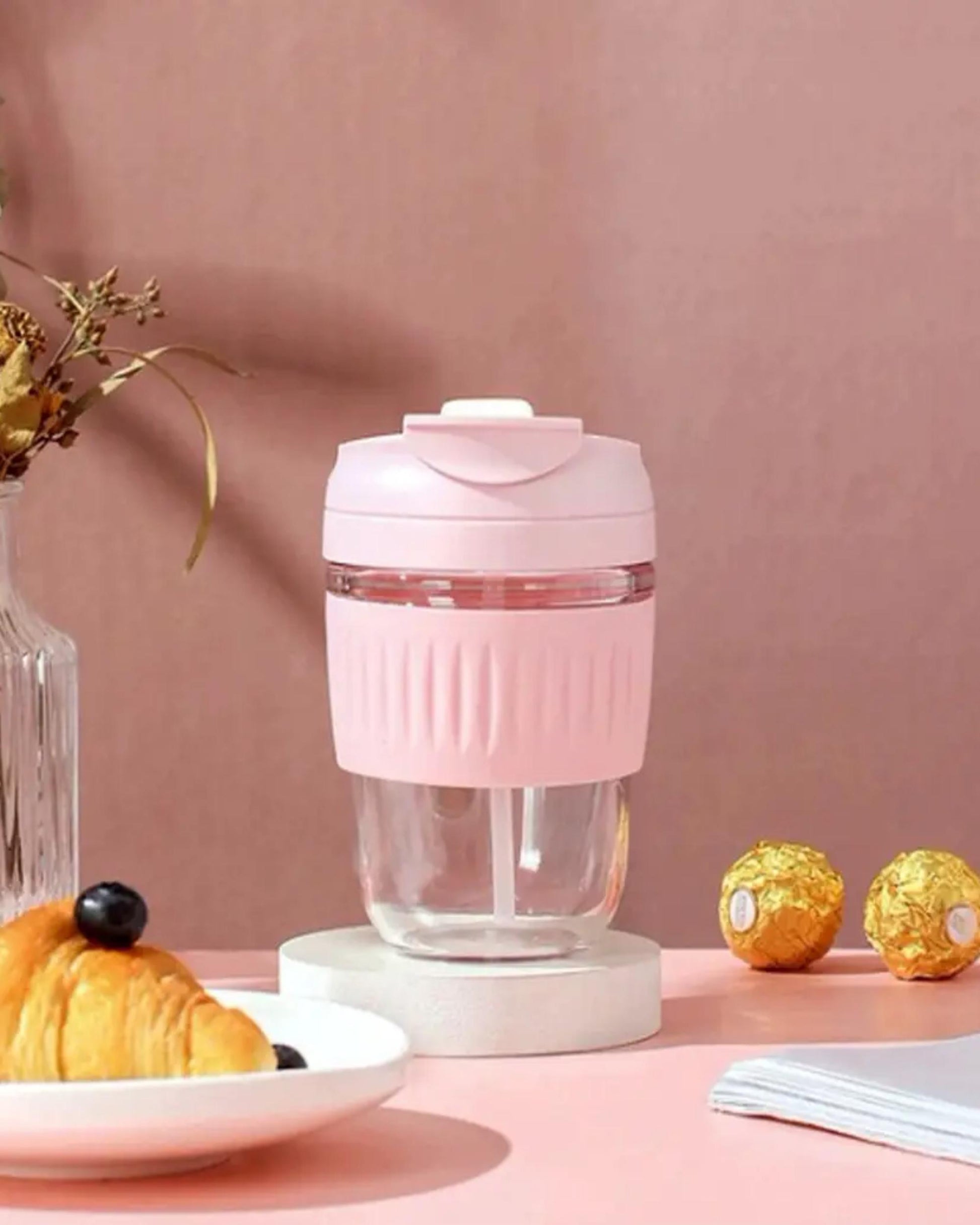مج زجاج بإطار جلد - بينك