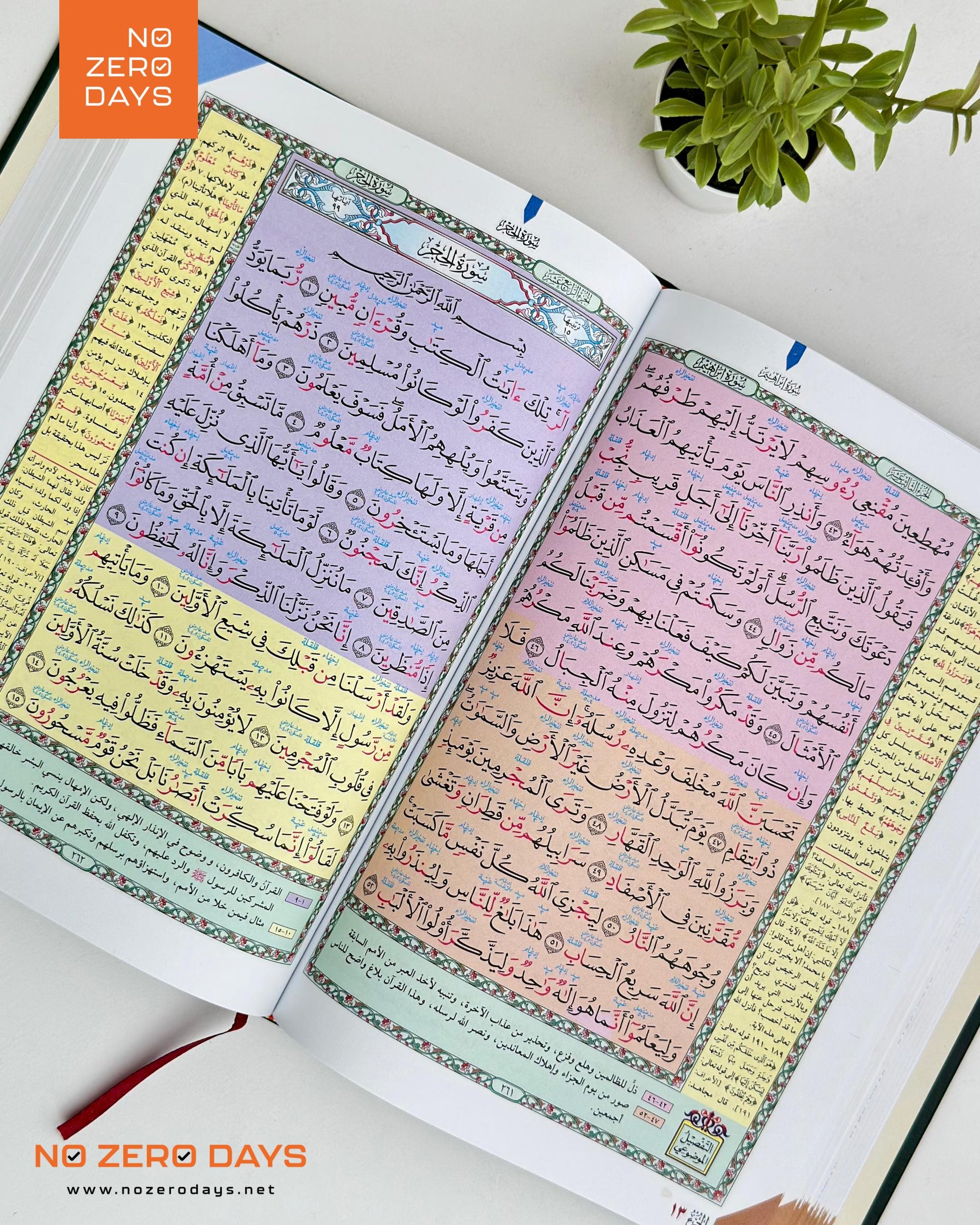 • توضيح أحكام التجويد على الآيات مع تلوين الحروف الخاصة بالتجويد